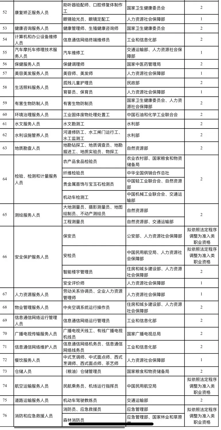 为贯彻落实2019年12月30日国务院常务会议精神,拟分批将水平评价类技能人员职业技能退出目录,其中:人力资源社会保障部门和有关部门组织实施的14项职业技能(涉及29个职业)拟于9月30日前第一批退出;其他部门(单位)组织实施的66项职业技能(涉及156个职业)拟于12月31日前第二批退出;与公共安全、人身健康等密切相关的职业(工种)拟依法调整为准入类职业技能(具体安排详见附件)。