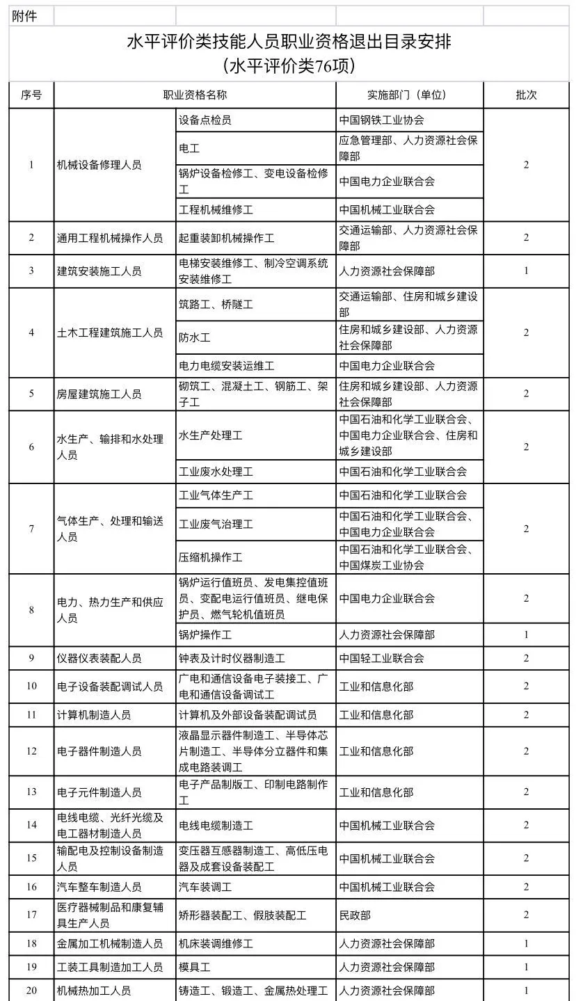 2020年7月10号,人力资源社会保障部办公厅发布了,关于对水平评价类技能人员职业技能退出目录有关安排的公告。