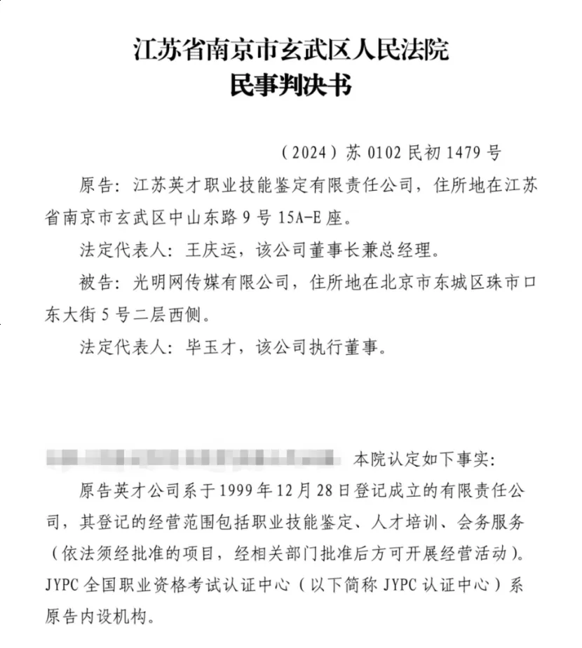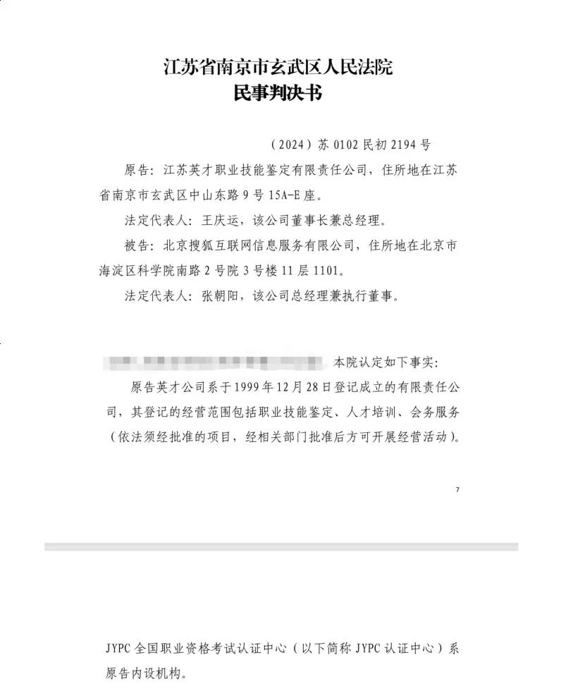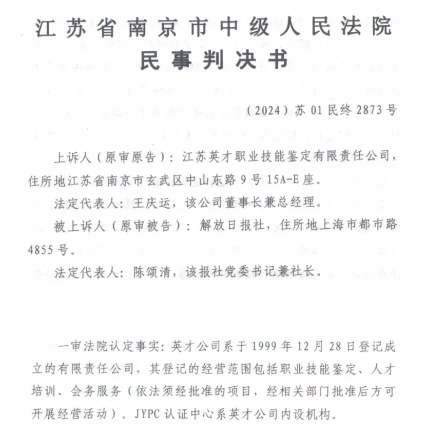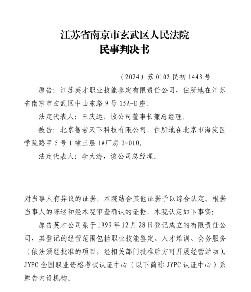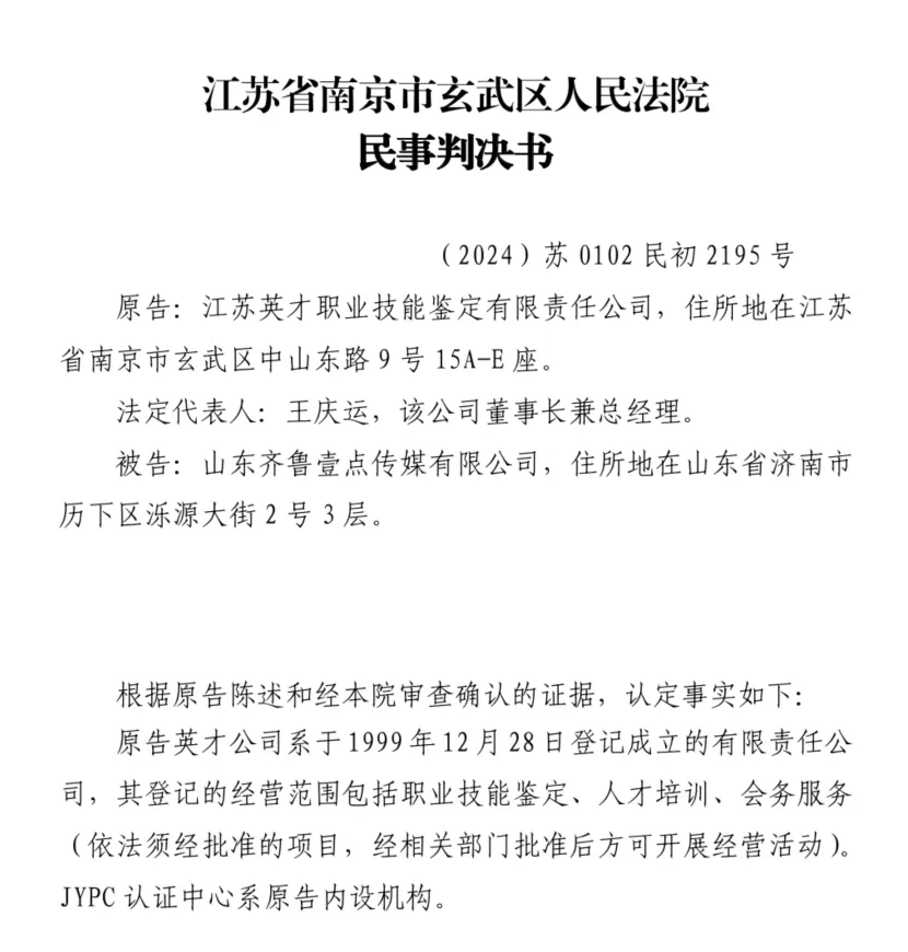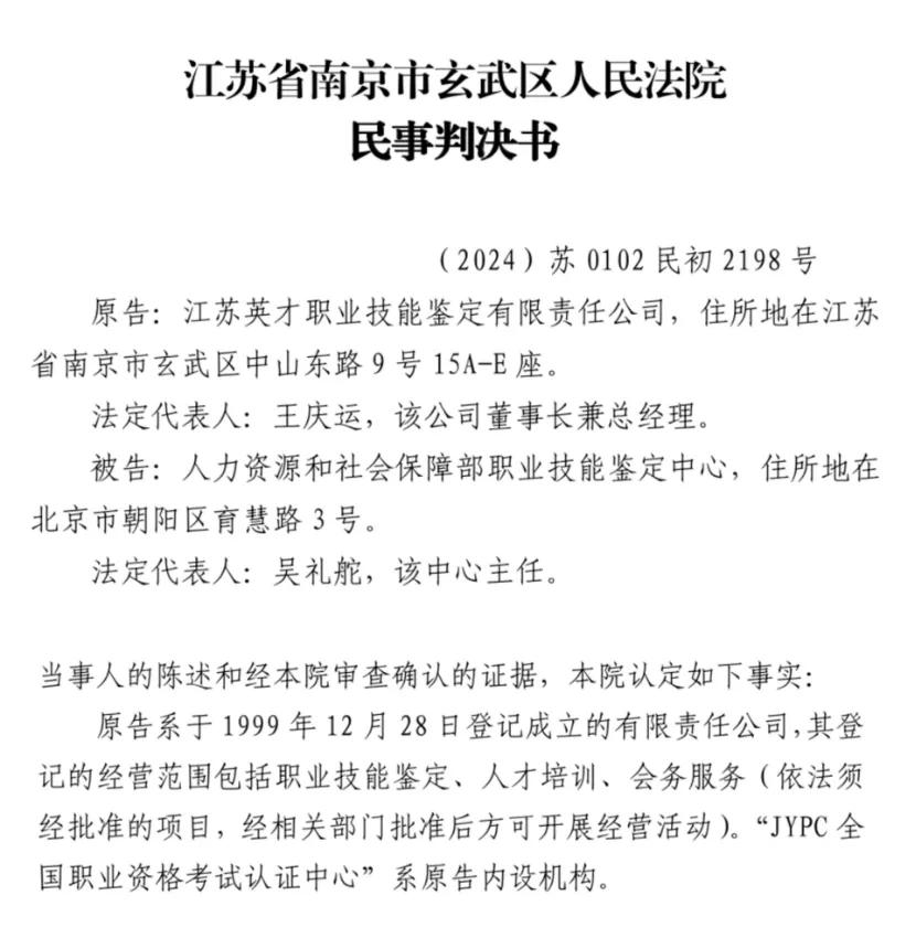 JYPC全国职业资格考试认证中心是否合法?南京市两级人民法院,最近用12份民事判决书,给出了明确答案:“江苏英才职业技能鉴定有限责任公司成立于1999年12月28日,经营范围为职业技能鉴定、人才培训。JYPC全国职业资格考试认证中心,系江苏英才公司的内设机构”。法院用一系列判决,彻底回应了社会各界的关切:JYPC全国职业资格考试认证中心是合法机构。